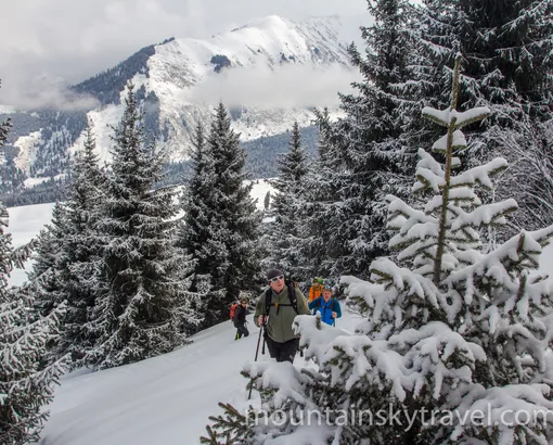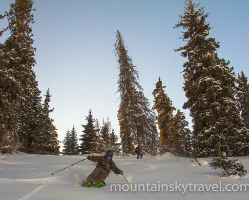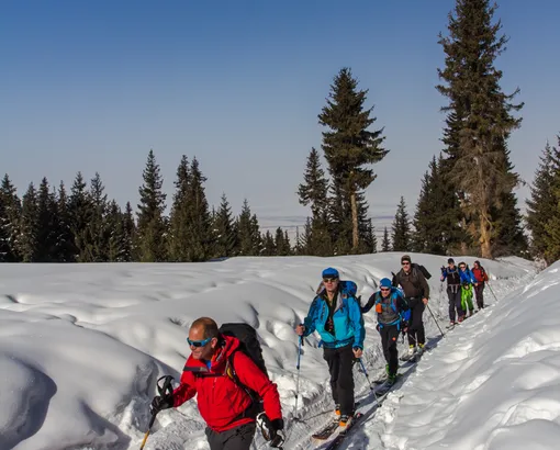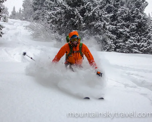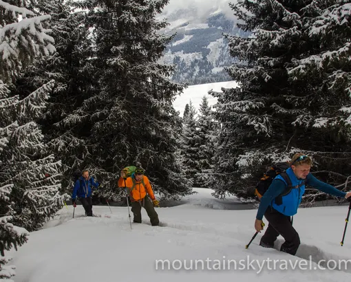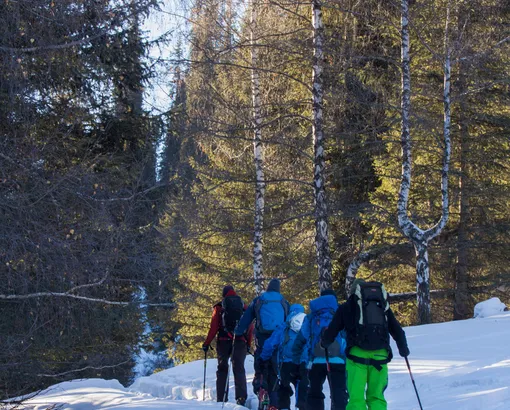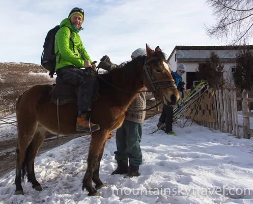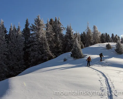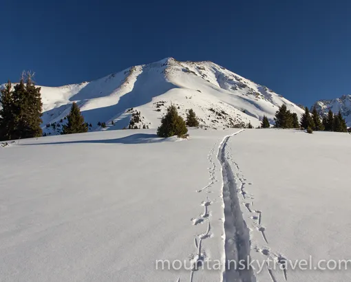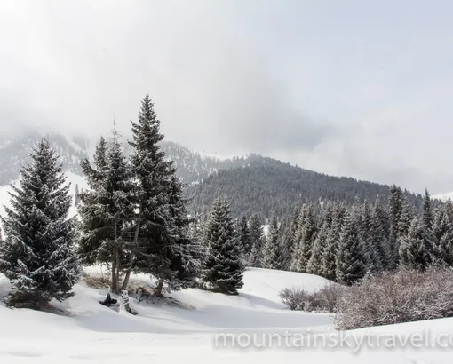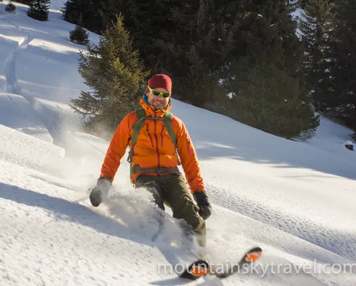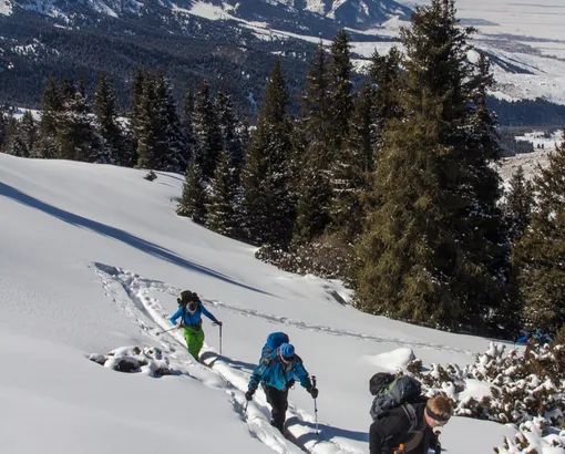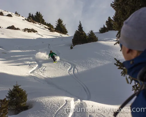 The program is designed for confident off-piste skiers. The ski area is very extensive, steep slopes are between 20 and 35 degrees. A difference in elevation is up to 1300 meters. For ascents and descents we offer a variety of ski area with different relief. Most of the route runs along the wooded slopes, so we remind of the need of protective helmet. There is possibility walking parts during which the skis (snowboard) are carried on a backpack. Karakol snow is usually very deep. For comfortable riding is recommended to use the skis with a waist of at least 100 mm. We drive by car from the town to ski area.