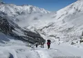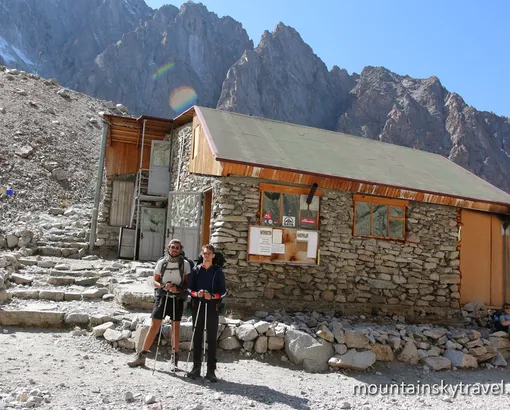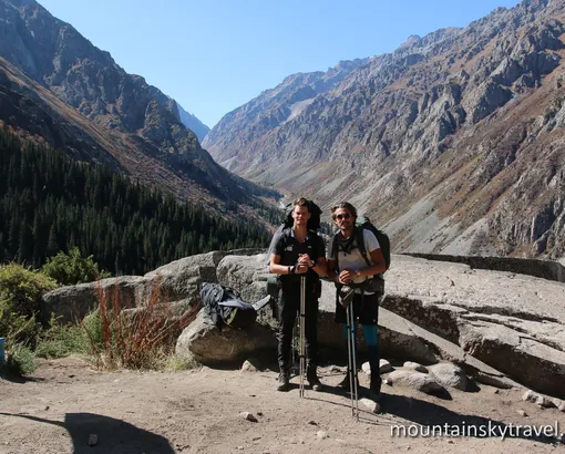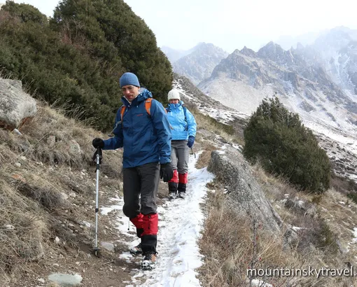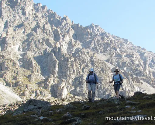 The road takes about an hour by car to Ala-Archa resort. There we go deeper into the spruce forest not far from main road. The path gently climbs up along the slope and brings us to the rock with name "Broken Heart" and then further to high-altitude meadows. Then crossing Sharkyratma stream, we come up to Ak-Sai waterfall. Here is good place for relax or lunch. We continue our way upon long steep climb, and in the end you can enjoy beautiful panorama from Ratsek hut. Some rest is planned near mountain huts, among rocky walls and snow peaks. Altitude is here 3300 meters above sea level. For example Bishkek locates on 700 - 900 meters. This is the ending point of today's tour for normal people.