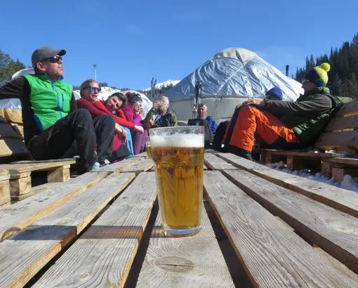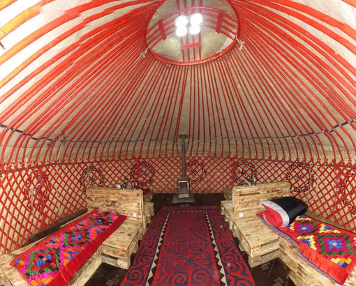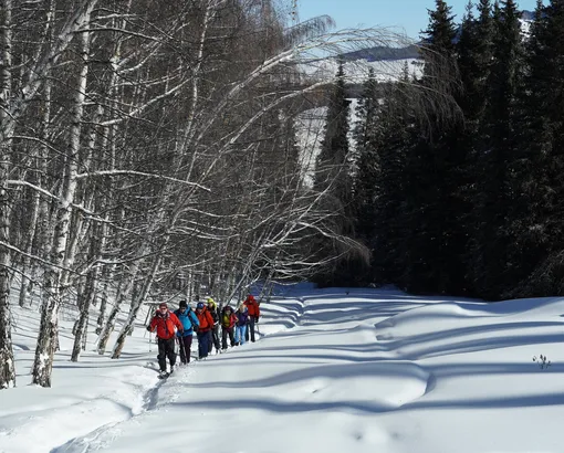 In the evening, you go down to the already heated yurts. Each yurt has 4 beds, electric lighting and sockets for charging your electronic devices. There is also a yurt-dining room, toilets. Before you even have time to take off your boots, a friendly team of staff will treat you to barbecue and beer. And a professional chef will later feed you a delicious dinner. After a hard frosty day, it is nice to warm up in a real hot steam bath. Or just wash off the sweat with warm water.