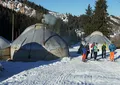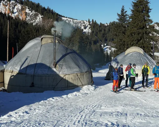 In a quiet, unvisited corner, at an altitude of 2,300 meters, there is a cozy yurt camp. A yurt is a traditional dwelling of nomadic Kyrgyz, and is still made by hand. A dozen white yurts are installed in a beautiful clearing among a spruce forest, next to a crystal clear stream. They fit perfectly into the concept of the Kyrgyz Mountains. The heat, just like that of the nomads, comes from a wood-burning stove installed in each yurt. The camp can only be reached by snowmobile or skis. This is what guests have been coming here for many years. One-day backcountry trips begin right from the threshold of the yurt.