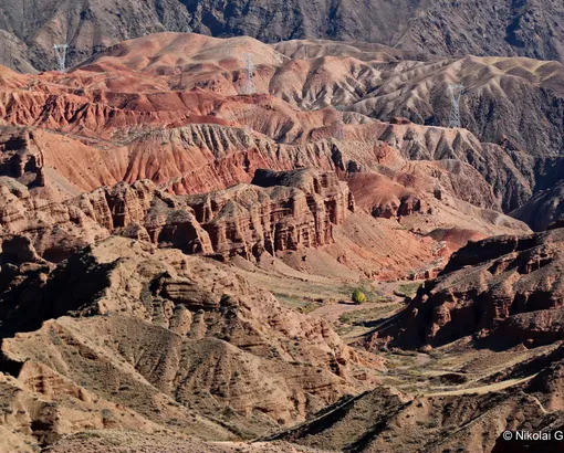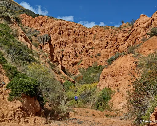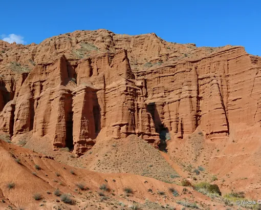Here, between Komorchek and Kyzylsu river nature has transformed mountains into a work of art. Dry, with specific types of drought-resistant vegetation, canyons looks like of fantastic dilapidated castles, ancient temples, modern skyscrapers, columns and spires.
