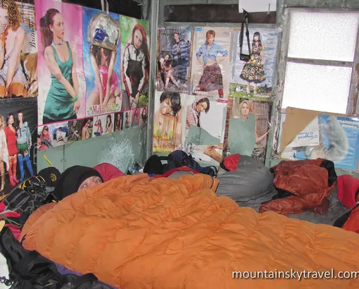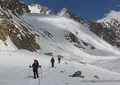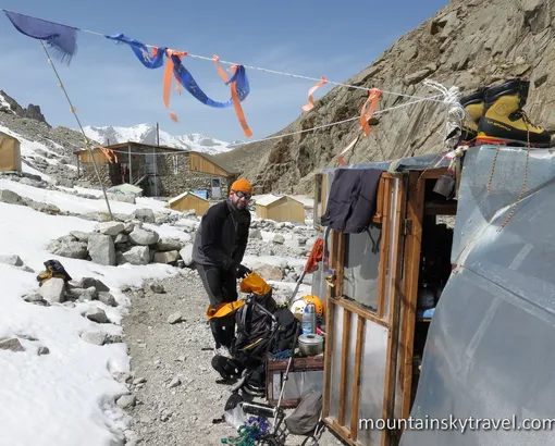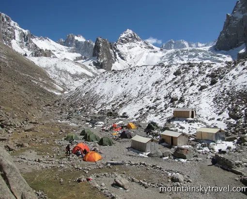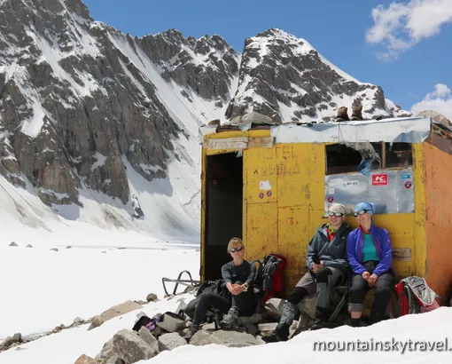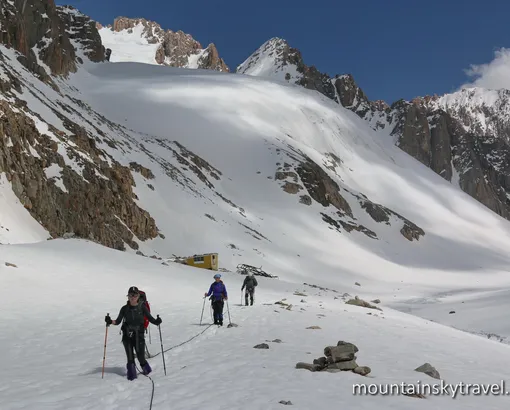 After the breakfast we pack our stuff and go upon moraine along the left side of icefall to plateau of Ak-Sai glacier. Further our way lies over the glacier; here we need harnesses, ropes and ice axes. Upon arrival to the hut we have a rest, then there would be trainings on working with rope and equipment. Overnight in Corona hut. During climbing season there are not enough sleeping place in the hut; in this case overnight in tents.