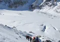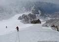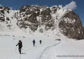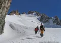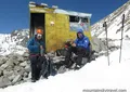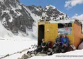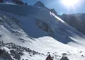 We leave after early breakfast. We put harnesses, helmets and crampons on in the cabin and does not take them off for all day. After the first steep climb we will make rope teams because there may be cracks along the path. Further, depending on the condition of snow and ice on the route, we ascent by aid climbing. The entire route is ice-snow surface and the only top 20 meters is not complicated part of route. Panorama from here is great - as it is one of the highest peaks of the Kyrgyz ridge. Descend by the same path of ascent. Overnight on Corona hut.