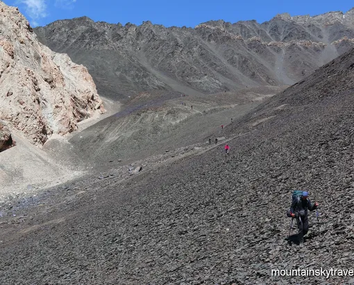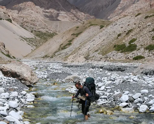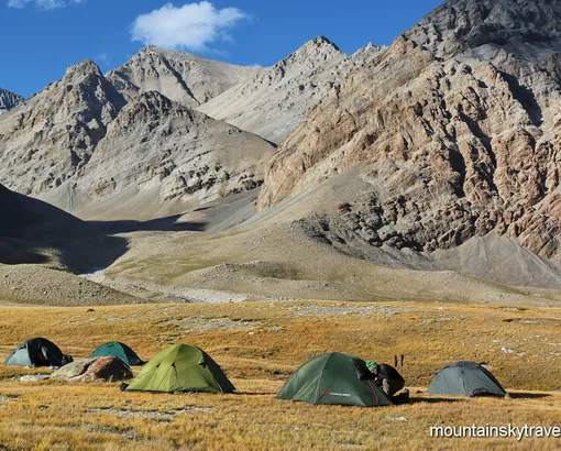 We are moving to the headwaters of the Kok-Jar river. A simple flat pass and we find ourselves in the neighboring gorge. There are many moraine lakes here. Overnight in tent camp on the moraine.