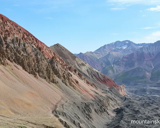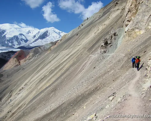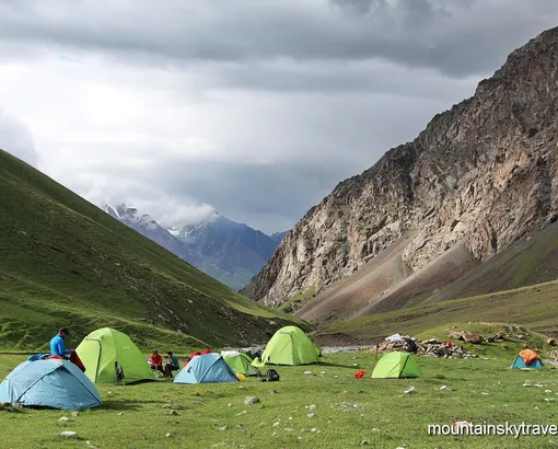 Breakfast in the dining area of the base camp (only for the full package). We leave base camp with light backpack, taking only sleeping bags, warm clothes. The trail passes through the famous Lukovaya Polyana (“Onion Meadow”). Marmots are not frightened and happy “to pose” for photographers. We we overcome Travelers’ pass (4100 m), and go along Lenin glacier. Multi-colored rocks and the glacier itself are very impressive.