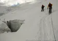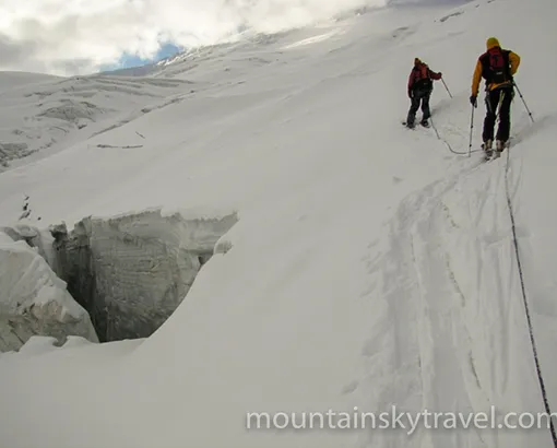 The path from the First Camp to the Camp 2 (5400 m) is given very hard both physically and psychologically. Many glacial crevices and some risk avalanche make this place the most dangerous on the route. You need to leave Camp 1 long before dawn. This will allow you to minimize the danger and to avoid the hot sun in the afternoon. It is necessary to use rope and protection equipment for glaciers all the way. Crevices are found even in the Camp 2 spot between the tents. There are fix ropes in the most dangerous places, using of jumar (ascender) or prusik is recommended. The first acclimatization trip an average of 6-7 hours. On steep parts it's easier to go in climbing crampons and fix skis on backpack. Camp 2 is located on a small moraine under the rocks or close to this moraine.