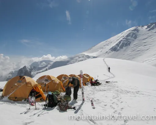 Above Camp 2 is no longer the heat that at the previous section. Early exit is not necessary here. There are two snow-ice steeps on the way to Camp 3 (6100 m), which are very difficult to take in the acclimatization period. Here, many go without a rope, although cases of falling into the cracks were. It is also easier to go in climbing crampons on the steep. At an average rate of 4-6 hours before Camp 3 near the top of the Razdelnaya Peak. The camp is located on a snowy plateau, and you need the shovel for fixing your tent. This camp is for summit day. From here it is necessary to climb to the top and return back for one light day. If you plan to ski on the northern wall of Lenin Peak this should be to Camp 1 before dark.