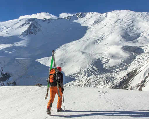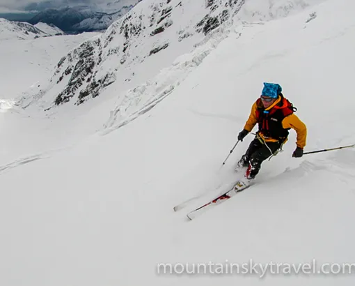 Lenin Peak 7134 meters elevation is in the Pamir Mountains. Every year, several hundred people from all over the world try to climb to this summit. Normal route has no technical difficulties and now more and more skiers are trying their hand on the slopes of Lenin Peak. You can ski down from the top along the north wall. Simpler routes from the lower levels are also available.