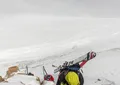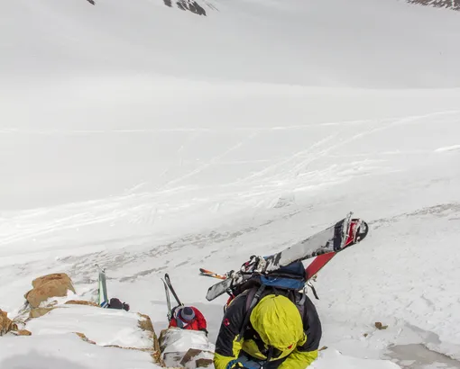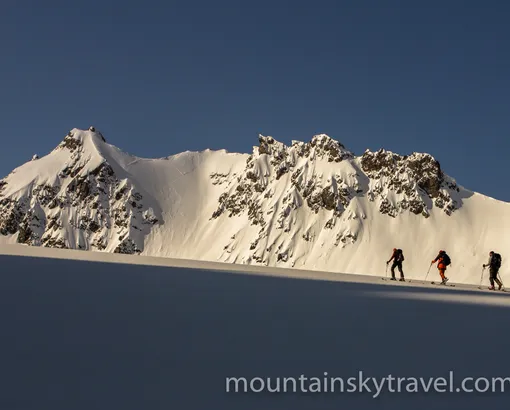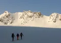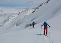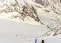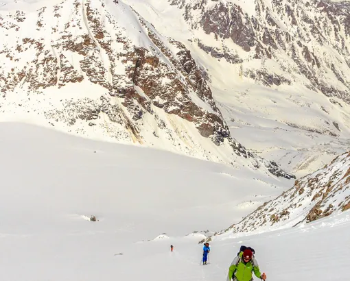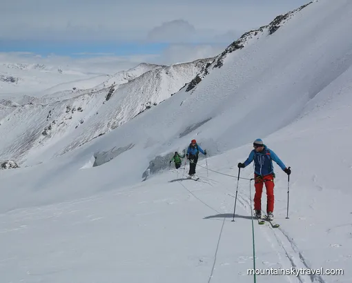 Breakfast. The ski routs start right from the hut. You can have one or more the ups and downs. It is 500-800 vertical meters once. There are different kinds of routes, from easy to the steep couloirs and ice-falls. It is necessary to use ropes and harness. At the end of the day will be dinner at the hut.